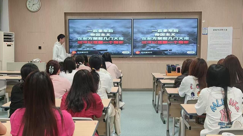 活动前期,团支书余姚分别以“新中国成立初期”“20世纪60年代”“20世纪70年代”“改革开放后”为时间线,通过借助PPT向同学们讲述起中国外交的百年脉络。同学们都在认真倾听。当PPT内容讲述完毕时,同学们也忍不住纷纷上台分享。王娅丽同学首当其冲以鸦片战争后的一系列不平等条约为切入点,重现了清末“量中华之物力,结与国之欢心”的屈辱场景,结合《马关条约》签订时李鸿章的无奈与挣扎,引发同学们对“弱国无外交”的深刻思考。紧接着霍昱宏同学根据最近的时事热点“乌克兰弱国无外交”做出分享,更让同学们体会到中国的来时路的不易。