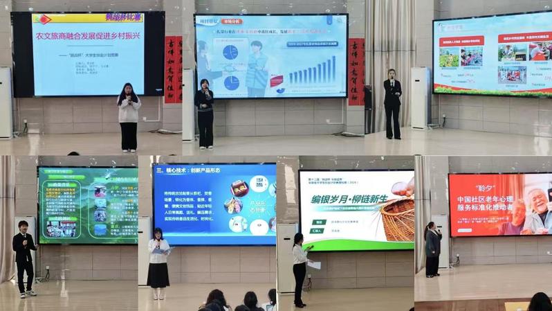 竞赛现场,各参赛团队依次登台,通过精彩的汇报,全面展示项目创意、核心优势、市场调研与发展规划,充分展现商务学子的创新思维与实践风采。评委老师们围绕项目创新性、落地可行性、市场实用性、团队架构等维度进行细致评审,逐一给出专业点评与优化建议,助力项目提质升级。