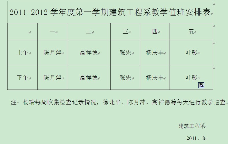 2011-2012学年度第一学期教学值班安排表