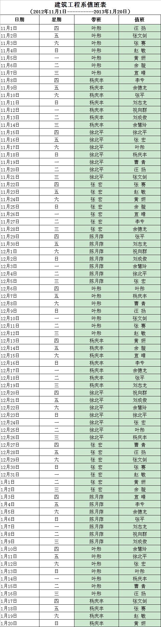 建筑工程系2012年11月-----2013年1月值班安排表