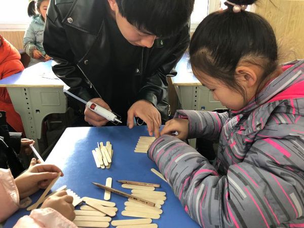 大学生志愿者们来到安庆市公园小学二年级的课堂上,在场的40余名小朋友们按捺不住好奇心,个个睁着萌萌的大眼睛,纷纷跃跃欲试。为了结合低年级同学的思维特点,尽可能让孩子多参与到具体的环节中来,提高他们创新意识,张欢欢老师设计了用冰棍搭建自已理想中的房子比赛,小学生们动手,大哥哥大姐姐分组指导。在活动过程中,小朋友们时而紧皱眉头思考、时而睁大眼睛讨论,短短几分钟,之前还略显寂静的教室就迅速升温,现场一下子沸腾起来。成长的乐趣并不仅仅在于回答未知,而在于探索的历程,通过孩子们的努力,把想象中的宫殿、农舍、教学楼一一变成漂亮的模型,看着自己的作品,他们的脸上露出了兴奋又得意的笑容。