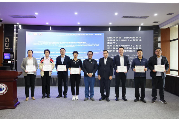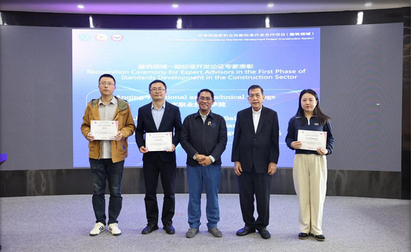 浙江建院副校长徐哲民、菲律宾职业技术教育与技能发展署资格与标准办公室执行署长埃尔・西德・卡斯蒂略、中菲丝路学院基金会主席张红阳在会上先后致辞。菲方代表充分肯定了beat365官网建工团队参与编制的《智能楼宇管理员标准》《防水工标准》《建筑信息模型技术员标准》等三项技能标准,并向教师代表颁发了成果证书。