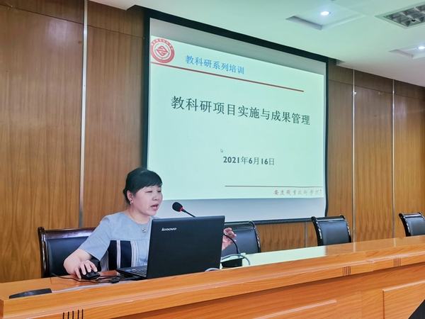 教务处副处长杨晓惠以“教科研项目实施与成果管理”为题,详细介绍了教科研项目区别和级别分类以及教科研项目实施与管理过程、教科研项目成果认定等方面需要注意的事项。