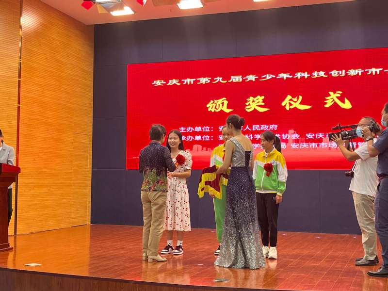 仪式现场,洪爱敏为安庆市第九届青少年科技创新“市长奖”提名奖获得者刘娟颁奖。