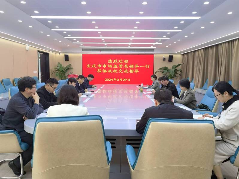 3月29日,安庆市市场监督管理局副局长金鑫、经开区市场监督管理局局长李怡和一行六人来beat365官网交流指导。校党委副书记、校长毕明生,校党委副书记李克让热情迎接。机电工程学院、信息技术学院、农林与服装学院和建筑工程学院、科创平台、科技处有关负责同志参加会议。