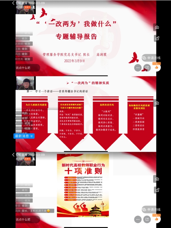 疫情防控不松懈,理论学习不放松。3月9日下午,该院党总支书记、院长高润霞采用线上方式、利用钉钉直播课堂作“‘一改两为’我做什么”专题辅导报告,该院全体教职员工聆听了报告。