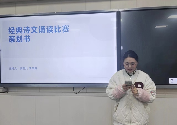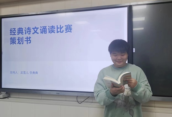 为传承中华传统文化,深入挖掘中华经典诗词中所蕴含的文字文化,提高大学生解读经典与书写汉字的能力,增强文化自信,班级举行了“经典诗文诵读”活动,大家在活动中诵读经典,品味书香。