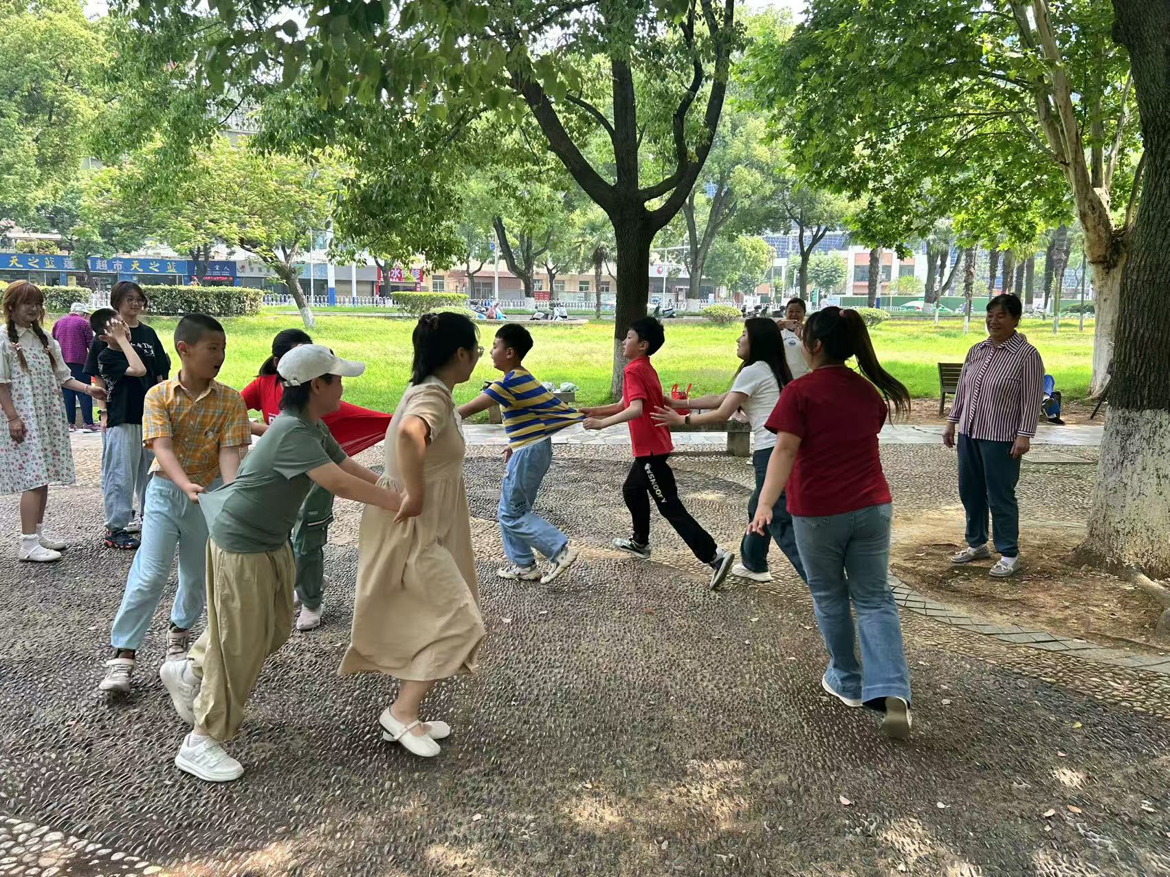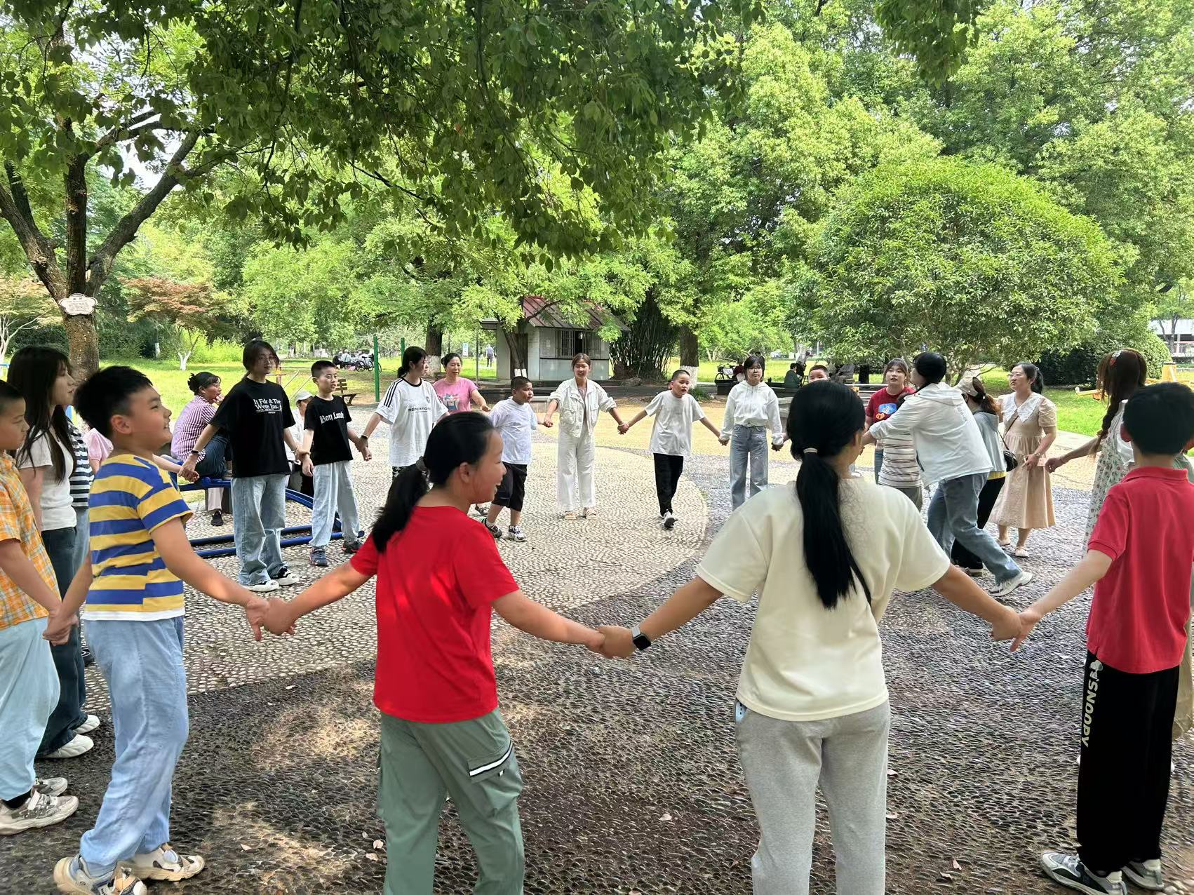 活动以“音乐唤醒活力”拉开序幕。志愿者们播放《你笑起来真好看》《勇气大爆发》等轻快旋律,带领孩子们跟随节奏拍手、转圈、跳跃,逐渐打破拘谨,舒展身心。随后,分别开展了“守护泡泡”协作游戏、“自然探秘”创意手环、“活力冲锋”老鹰捉小鸡、“团结列车”贪吃蛇开火车四组特色游戏,将康复训练与趣味体验深度融合。游戏环节结束后,志愿者与孩子们围坐成“爱心圈”,共同演绎《小花开了》《公交车的轮子》《好宝宝》等舒缓律动操。孩子们跟随音乐摇摆,用肢体语言表达内心的喜悦。