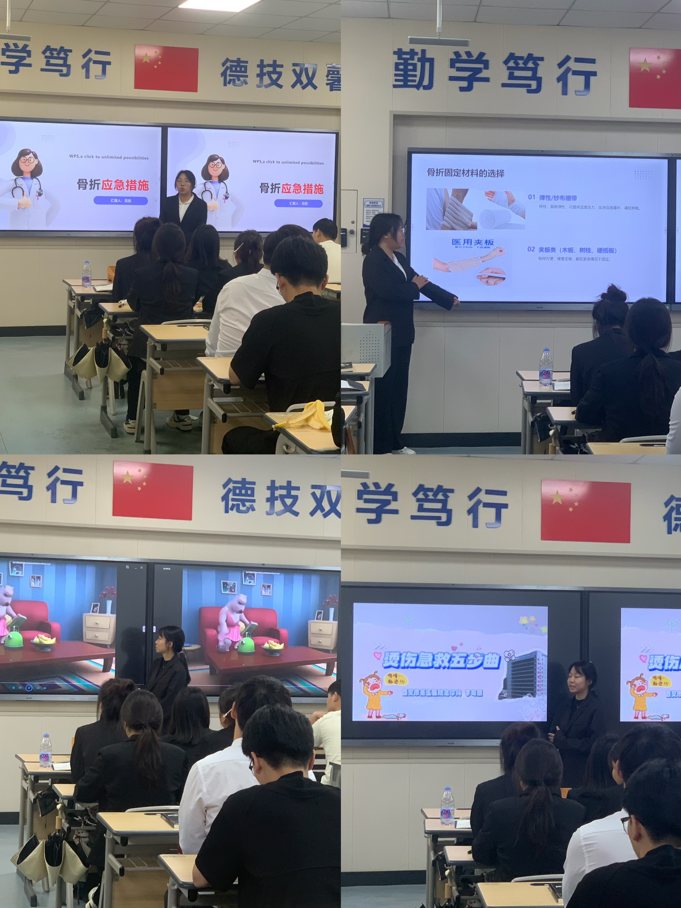 各组聚焦生活中可能遇到的紧急场景,精心准备了心肺复苏、动物咬伤、烧伤烫伤、气道异物梗阻、中暑、低血糖、骨折等实用主题的讲解。形式创新是本次活动的最大亮点,心肺复苏组同学将理论讲解(PPT图解原理与步骤)与现场模拟(规范演示按压深度、频率)紧密结合,清晰直观;动物咬伤组同学巧用原创动画,以生动角色和通俗旁白,清晰演绎冲洗、消毒、接种疫苗全流程;烧伤烫伤组成员通过播放专业处理视频,精准展示冷水冲洗、去除衣物、保护创面等应对不同伤情的技巧;气道异物梗阻组同学现场模拟海姆立克急救法,“施救者”与“被卡者”配合演示关键动作,引发课堂高潮;其他小组也各展所长,将中暑、低血糖、骨折等知识讲解得深入浅出。台上“小老师”倾情投入,台下同学们听得聚精会神,积极互动提问,认真记录要点,课堂气氛热烈活跃。