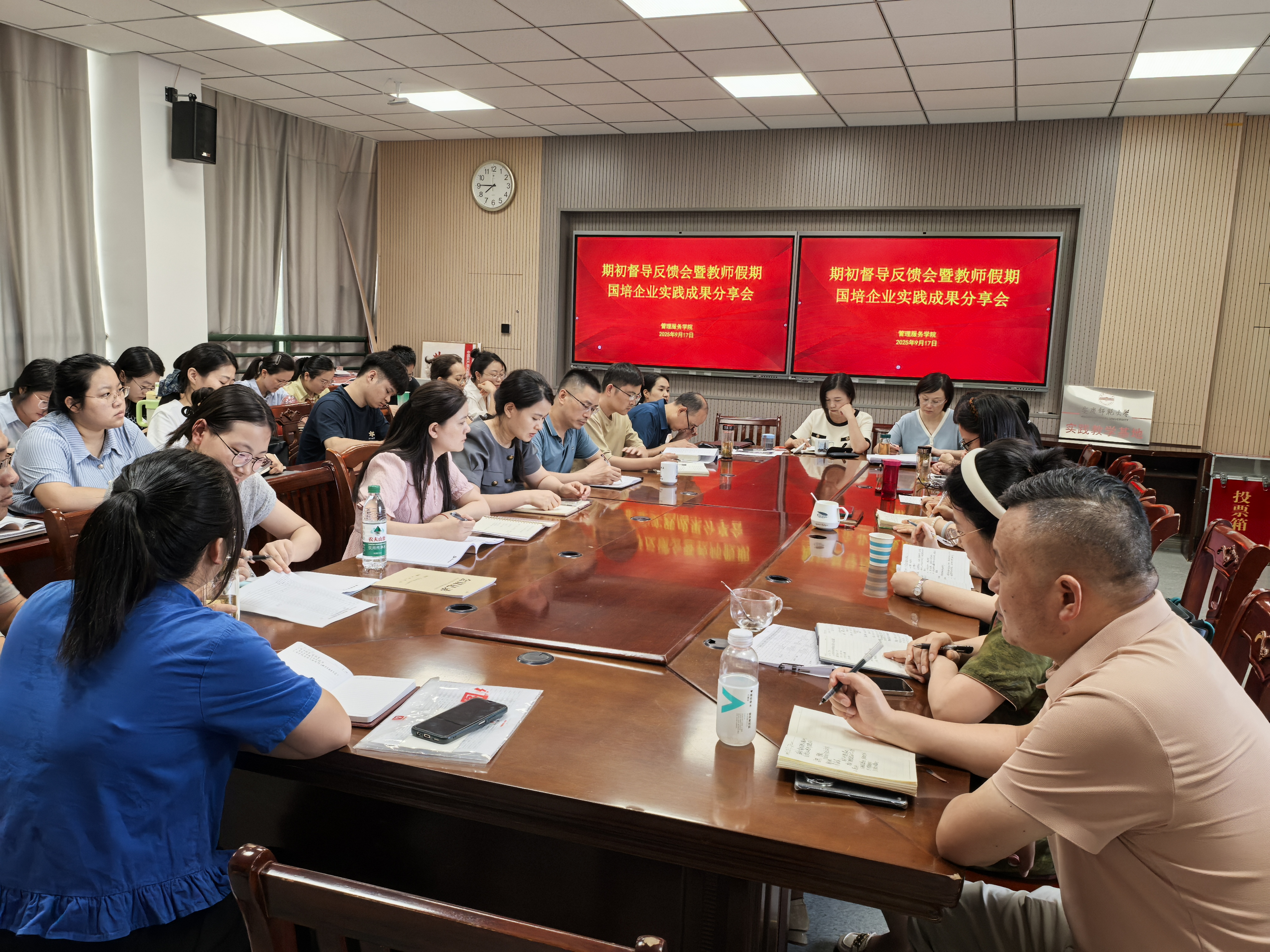9月17日,管理服务学院召开2025-2026学年第一学期期初督导反馈会,并同步举行暑期国培、执裁、挂职等实践成果分享。校教学督导朱宜娟、郭媛媛、黄先军三位副教授应邀出席,学院全体教师参会。