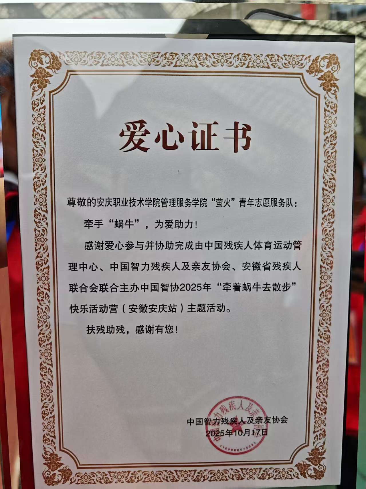 2025年10月17日,由中国智力残疾人及亲友协会主办的“牵着蜗牛去散步快乐活动营”(安徽站)在安庆体育中心温情启幕。管理服务学院党总支“37℃萤火”志愿服务团(即学院“萤火”青年志愿服务队)作为特邀志愿服务力量,全程参与活动保障,以专业、温暖的志愿服务赢得了各方高度赞誉,并被授予“爱心志愿服务团队”证书,生动展现了党建引领下青年志愿服务的深度、温度与担当。