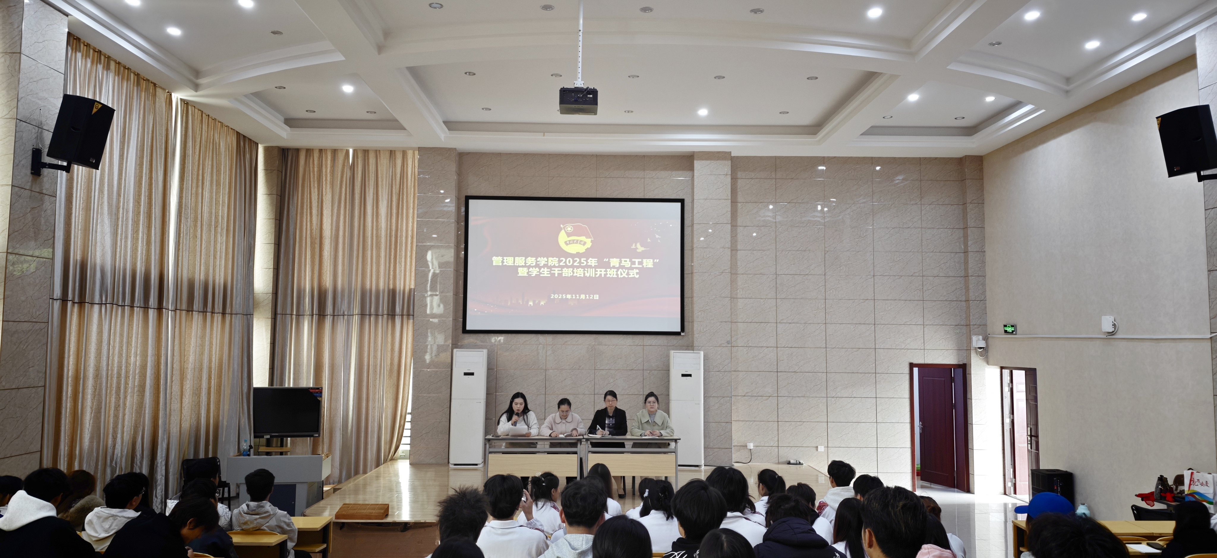 11月12日,beat365中文官方网站管理服务学院2025年“青马工程”暨学生干部培训开班仪式在学院报告厅举行。学院学生工作负责人、学生管理和团总支负责人、全体学员及学生干部代表参加仪式。
