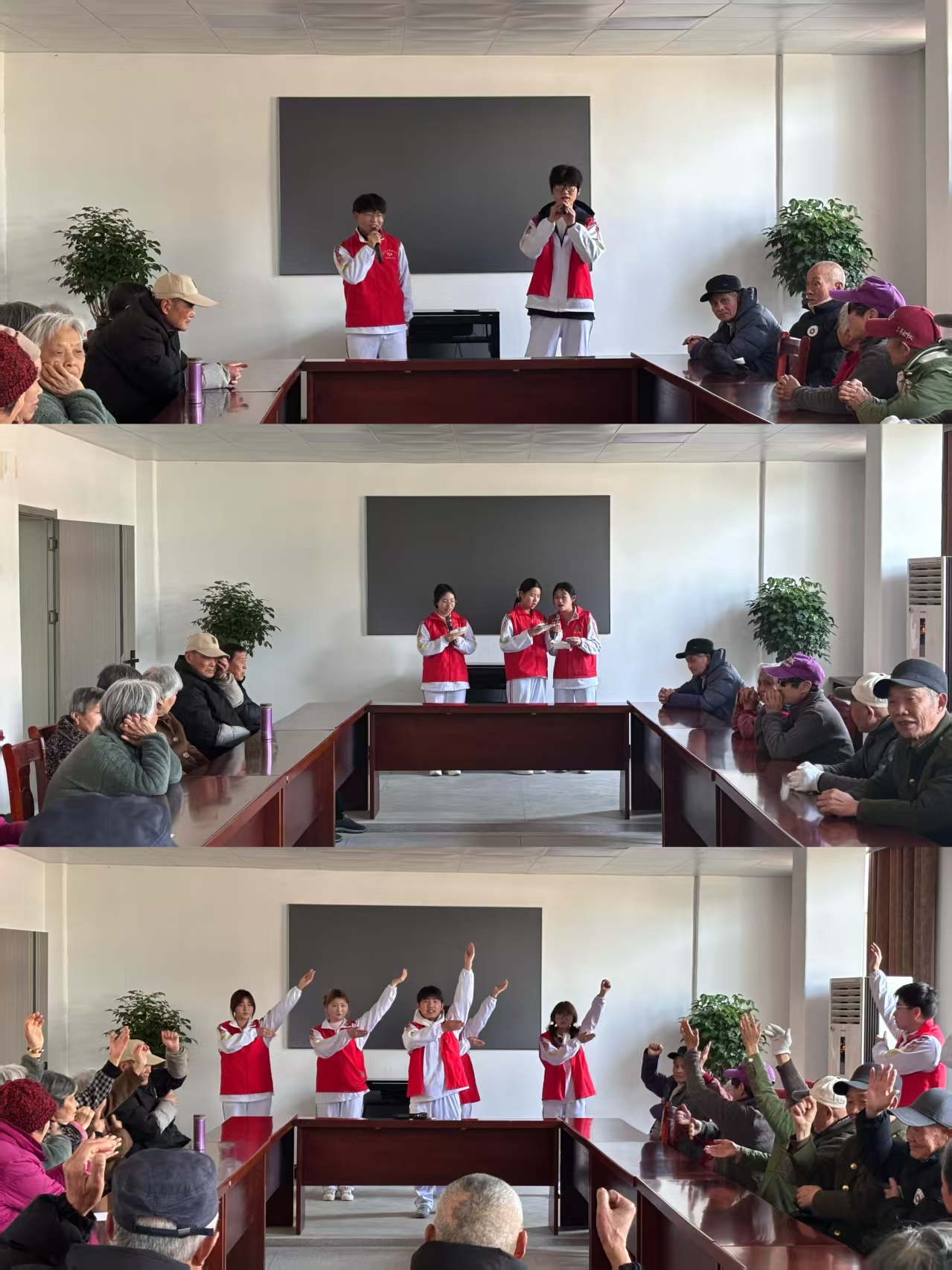 考虑到光荣院老人们均为退役军人,学子们精心编排了一组红色经典曲目。张明哲、叶永乐同学接连唱响《精忠报国》《强军战歌》《我和我的祖国》等歌曲,铿锵的旋律唤起了老兵们深埋心底的军旅记忆,有老兵情不自禁跟着哼唱,眼中闪烁着感动的光芒。张玉洁、汪丹丹、包佳楠同学带来欢快的《好运来》,用甜美歌声送上美好祝福;方富荣同学献上黄梅戏经典选段《谁料皇榜中状元》,乡音乡情沁人心脾。刘毅、赵敏等同学还带领老兵们做《拍八虚养生操》,将专业养老健康知识融入实操,让老兵们在轻松氛围中学习养生技巧。