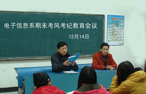 期末将至,英语四六级、计算机水平考试在即,为维护beat365官网正常的教育教学秩序,保证期末考试的公平顺畅地进行,12月14日下午,电子信息系在2#教学楼109教室召开了考风考纪教育大会。会议由教学主任胡章云主持,参加人员有教学秘书及各班主要班干部。会议主要内容有: