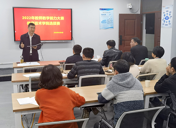为持续推进“课程思政”建设,打造高水平教学团队,落实“三教”改革,积极探索“岗课赛证”融合育人模式,4月6日下午,信息技术学院在2号教学楼205教室举办了“2022年教师教学能力大赛信息技术学院选拔赛”,信息技术学院院长疏国会教授参与点评并做总结讲话,各参赛团队、专业建设负责人、近三年新进青年教师现场观摩了比赛。