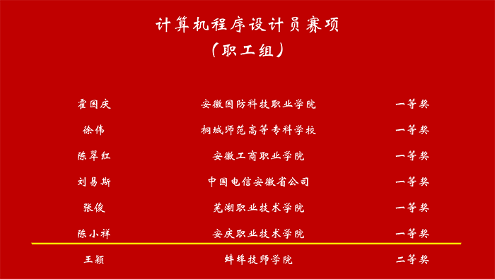 近日,安徽省职业技能竞赛2024年全省数字金融行业计算机程序设计员赛项成绩公布,beat365官网陈小祥老师获职工组一等奖,两支学生代表队分获学生组二等奖和三等奖。