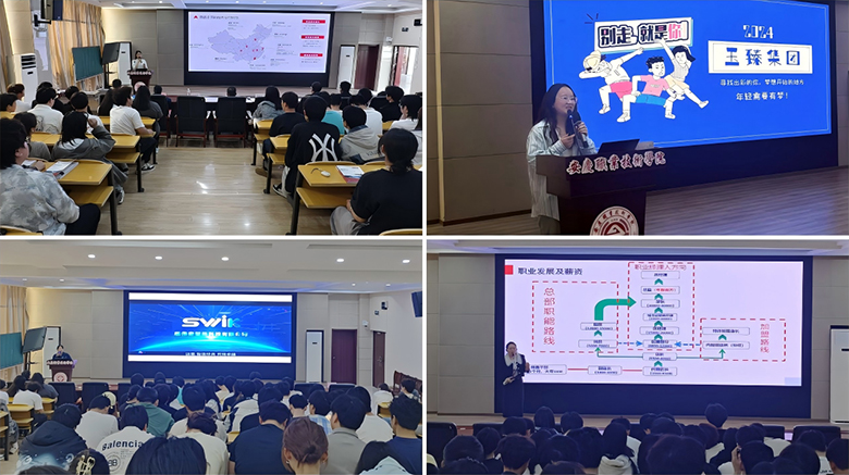 在宣讲环节,企业代表依次登台,各展风采,全方位、多维度地深入介绍公司成长轨迹、职位空缺 ‘地图’ 以及职业发展 ‘上升通道’。订单班企业安庆安畅网络科技有限公司率先宣讲,详细介绍了公司发展愿景、岗位需求和工作环境,他们专注于公有云运维领域,并推出CTTP云计算技术人才发展计划及选拔程序,计划招聘30名云计算运维工程师;安徽玉臻科技集团聚焦技术服务岗位,提出100余人的招聘需求;安徽邻几便利店有限公司则瞄准新零售领域,提供了20个智慧物流与运营管培生岗位;安徽思伟奇智能科技针对智能制造领域,提出了储备干部的招聘方案;南冥众创动画制作有限公司以数字创意产业为核心,计划招募30名动画设计与数字媒体领域的专业人才,其他企业专设招聘展位,进行宣传交流。