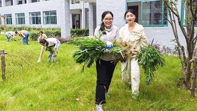 经过近一小时协力奋战,原本杂草滋生的草坪焕然一新。被清理出的杂草杂物堆成小山,整洁开阔的绿地重新展露勃勃生机。这焕新的不仅是环境面貌,更是党员们对“信园”这片育人沃土的深厚情感。