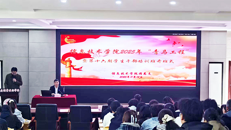 为深入实施青年马克思主义者培养工程,强化学生干部队伍建设,提升青年学生的政治素养与责任担当,11月12日下午信息技术学院2025年“青马工程”暨第十六期学生干部培训班开班式在216信仰报告厅举行。学院党总支书记、院长疏国会,党总支副书记陈富汉、团总支书记杜青出席开班式,90名学员参加开班式。