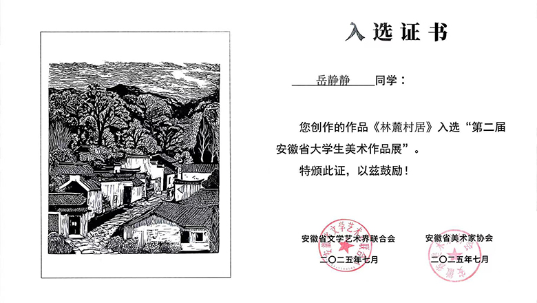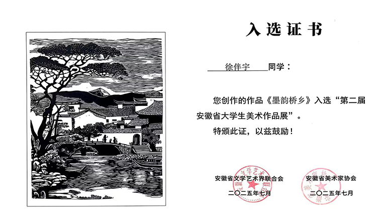 近日,由安徽省美术家协会、安徽省文学艺术界联合会主办的“第二届安徽省大学生美术作品展”复评工作圆满结束。beat365官网由信息技术学院施展老师指导的2024级数字媒体艺术设计专业学生岳静静和徐伴宇创作的两件作品入选展览,实现了beat365官网在该省级大展中零的突破,充分展示了beat365官网在美育教育和专业技能培养方面的扎实基础与育人成效。