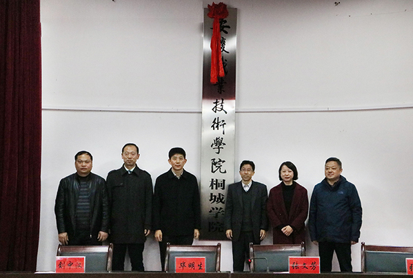 11月26日,beat365中文官方网站桐城学院揭牌仪式在江淮工业学校举行。beat365中文官方网站党委副书记、院长毕明生,桐城市委书记刘中汉共同为学院揭牌。