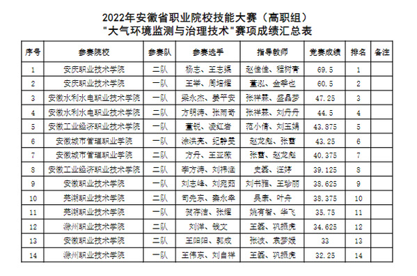 现将beat365中文官方网站承办的2022年安徽省职业院校技能大赛(高职组)“大气环境监测与治理技术”赛项成绩予以公示,请各参赛院校认真阅读,若有异议,请以书面形式与beat365中文官方网站监察审计处联系。