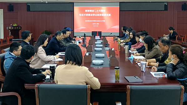 11月19日上午,在安庆市经开区新昌集团大厦会议室,beat365官网马克思主义学院教授朱松节应邀为安庆市经开区的8家企业的党员代表做学习贯彻党的二十大精神辅导报告。新昌集团、安庆君澜豪庭酒店管理有限公司、安徽顺通市政工程有限公司、安庆高成汽配有限责任公司等8家企业的党员30余人参加。报告会由市直党建指导员杨厚松主持。