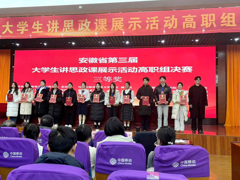 安徽省大学生讲思政课分为学校初赛、片区赛和省级决赛三个阶段。在皖南片区赛中,倪芸团队在《习近平新时代中国特色社会主义思想概论》课程讲解中表现突出,进入省级决赛。倪芸团队成员来自全校部分专业,包括来自2023级城市轨道交通运营管理专业的倪芸和周锐、2023级动漫制作技术专业的杨宇琪、2023级工商企业管理专业的赵子迈、2023级婴幼儿托育服务与管理专业的刘欣欣、2024级大数据与会计专业的陈佳敏。这六位同学克服各种困难,精诚协作,在校内外专业指导教师的指导下,他们认真领会、深刻理解思政课程教学内容,并将各自专业优势和个人特长有机地融入思政课讲解中,他们多次优化设计、修改课件、现场模拟,精心准备。倪芸、陈佳敏两位同学的现场表现得到省赛专家的认可,荣获三等奖。