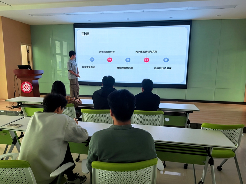 思政委员代表以《大学生国家安全教育》为题,围绕多领域安全解析、身边风险识别、青年责任义务等方面展开分享。学生代表以王继才、王仕花夫妇坚守孤岛、护卫国土的感人事迹为例,生动诠释了“岛再小,也是国家领土”的信念,深化了“国家安全在身边”的认知。