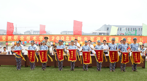 10点,市领导、院领导分别为“军训优秀连队”颁发奖旗,院党委书记高开甲向承训部队赠送锦旗。今年新生军训共有一营一连等10个连队荣获“军训优秀连队”,4号学生公寓625室等10个女生寝室,1号学生公寓640室等10个男生寝室被评为“内务整理标兵寝室”,张慧等68名同学被评为“军训优秀学员”。