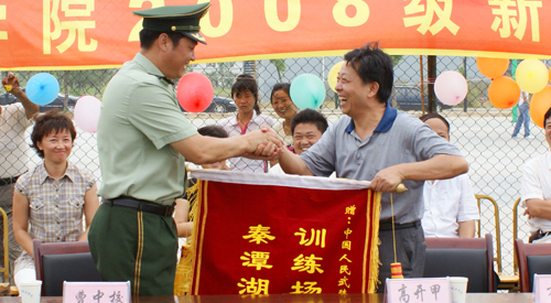 市领导、院领导、承训部队首长为“军训优秀连队”颁发奖旗