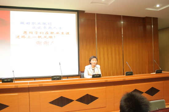 能容纳200多人的报告厅座无虚席,座位旁的走道上也挤满了听课的学生。讲座开始前,施院长介绍了近年来我院毕业生就业工作已取得的显著成绩、历届毕业生就业情况、正在组织举办的全院首届大学生职业生涯规划大赛和前期开展的毕业生跟踪调查情况,鼓励同学们认清就业形势,树立人生目标,明确职业定位,积极而又认真地做好职业规划。随后,施院长结合大量生动而又极具针对性的案例,就“什么是职业规划”、“怎样进行职业规划”和“规划的实施与调整”等三个方面,从理论层面到操作层面讲授职业生涯规划设计的基础知识和基本方法。他要求同学们在全面、深入、科学的自我认知、自我了解的基础上,树立信心,确立远大的目标,制定并实施职业目标的行动计划,确定实现职业目标的具体措施,根据需要,适时调整职业目标,通过不懈的努力,成就辉煌的职业人生。最后,施院长还介绍了目前大学生主要就业途径、国家的就业政策、大学生就业误区、国外灵活就业形式、我国职业准入制度、国家人力资源开发两大体系等方面的知识。