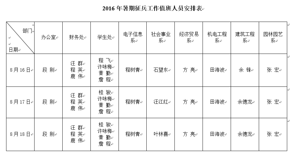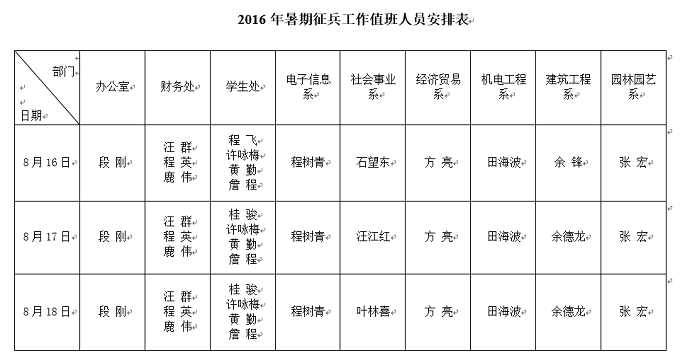 各系部: 为做好2016年夏季大学生征兵工作,方便应征入伍学生暑期返校办理有关手续,结合我院工作实际,应征入伍学生的政审工作与学费补偿代偿工作集中安排在8月16、17、18日三天。各系务必提前通知到有关学生,暑期征兵工作值班人员见安排表。学生政审鉴定意见由学生所在系值班老师审签,学费补偿申请的审核在综合办公楼财务结算中心与学生资助管理中心。 学生处 武装部 二〇一六年七月七日