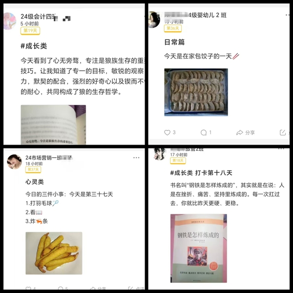 最令人动容的是那些“双向奔赴”的打卡故事。有学生每天陪父母晨练打卡,有学生和异地的好友相约“云读书”,还有辅导员悄悄加入打卡群,用每日寄语为学生加油打气。21天过去,改变的不仅是习惯,更是对成长的重新定义。