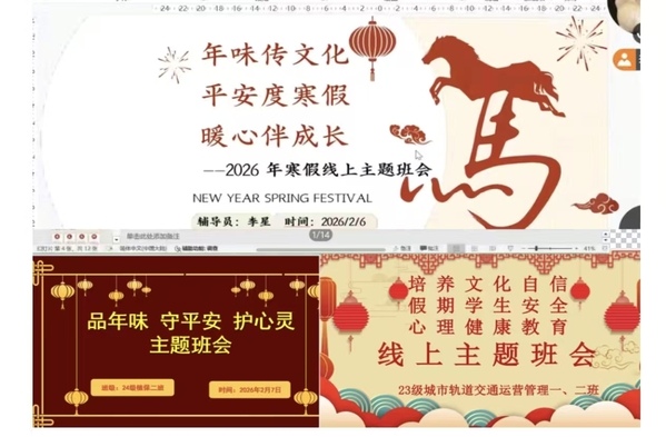 此次寒假系列活动将文化传承、安全守护、心理关怀、自律养成融为一体,让学生在“假期不停学”中收获“成长不打烊”。下一步,学校将继续创新育人形式,用更有温度的教育陪伴学生。(文:张亚萍/图:二级学院/审稿:李专)