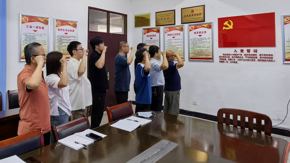 在鲜红的党旗下,党员们胸佩党员徽章,高举右拳,重温入党誓词,一声声铿锵有力的誓言唤醒着每位党员的入党初心,传递出永远跟党走的坚定信念。