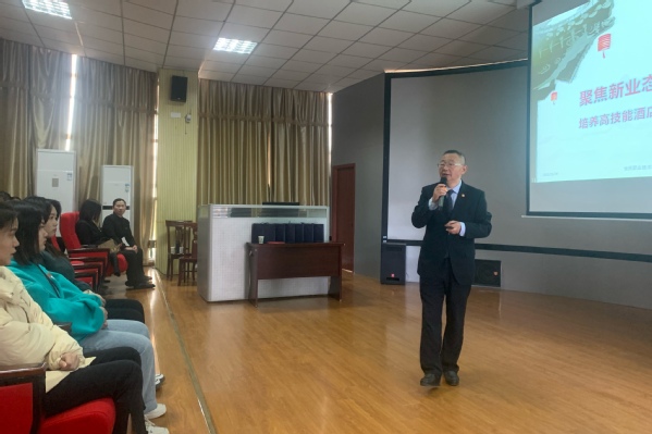 梁总从定义新业态、聚焦安庆酒店业发展以及如何培养新型酒店管理服务人才等方面展开讲述,教育学生从讲礼貌、讲礼节、讲礼仪做起,通过修炼技能、强健体魄、涵养德行,完美履行酒店人的服务职责,进而积累管理经验,建好团队,带好团队,成为现代酒店业新型高级管理服务人才。