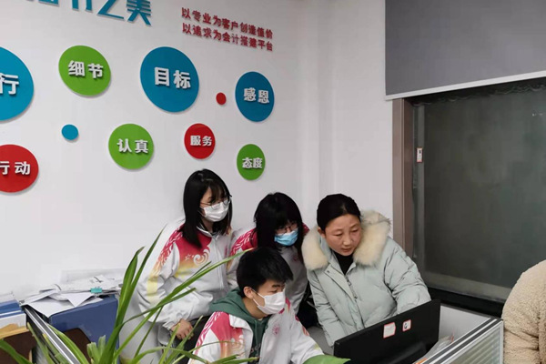 第二天,部分学生代表来到协成财务咨询有限公司参观、座谈,三人一组在师傅带领下上机操作,现场体验真实的财务和税收系统。