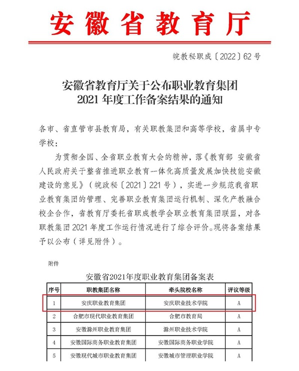 近日,省教育厅发出通报文件,安庆职教集团在全省54家职教集团2021年度工作运行情况综合评价中,以总分第一名成绩获评安徽省A类职教集团,实现连续四年荣获安徽省A类职教集团荣誉。