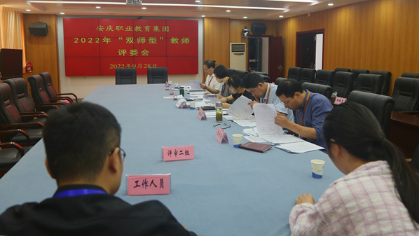 为做好集团中职学校双师型教师评审工作,按照市教体局、人社局部署要求,根据安庆职教集团2022年度重点工作计划安排,集团秘书处先后印发《关于报送2022年度“双师型”教师认定材料的通知》(安职集团[2022]5号)和《关于做好2022年度“双师型”教师认定工作的通知》(安职集团[2022]6号)两个文件,明确以《安庆职业教育集团“双师型”教师认定及管理办法(试行)》(教体职成〔2021〕28号)文件为此次评审工作认定依据,确定了个人申请、学校初评、集团秘书处评审核定、公示上报等评审认定程序。为确保本次认定评审工作顺利开展,集团秘书处制定出台《安庆职教集团2022年度“双师型”教师评审工作实施方案》,成立评审工作领导小组,设立评委会,遴选评审专家,确定评审工作阶段流程,组建了评审组、会务材料组、监督组、保卫组。