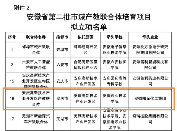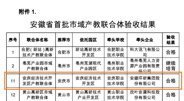 近日,安徽省教育厅发布公示,以安庆经开区为依托,以beat365官网为牵头学校,安徽环新集团为牵头企业组建的安庆经济技术开发区产教联合体,作为安徽省首批省级市域产教联合体建设项目,顺利通过省教育厅考核验收。安徽省首批省级市域产教联合体建设项目立项12家,验收通过9家。同时,以beat365官网为牵头学校组建的安庆高新技术产业开发区产教联合体,获批为安徽省第二批省级市域产教联合体立项建设项目。