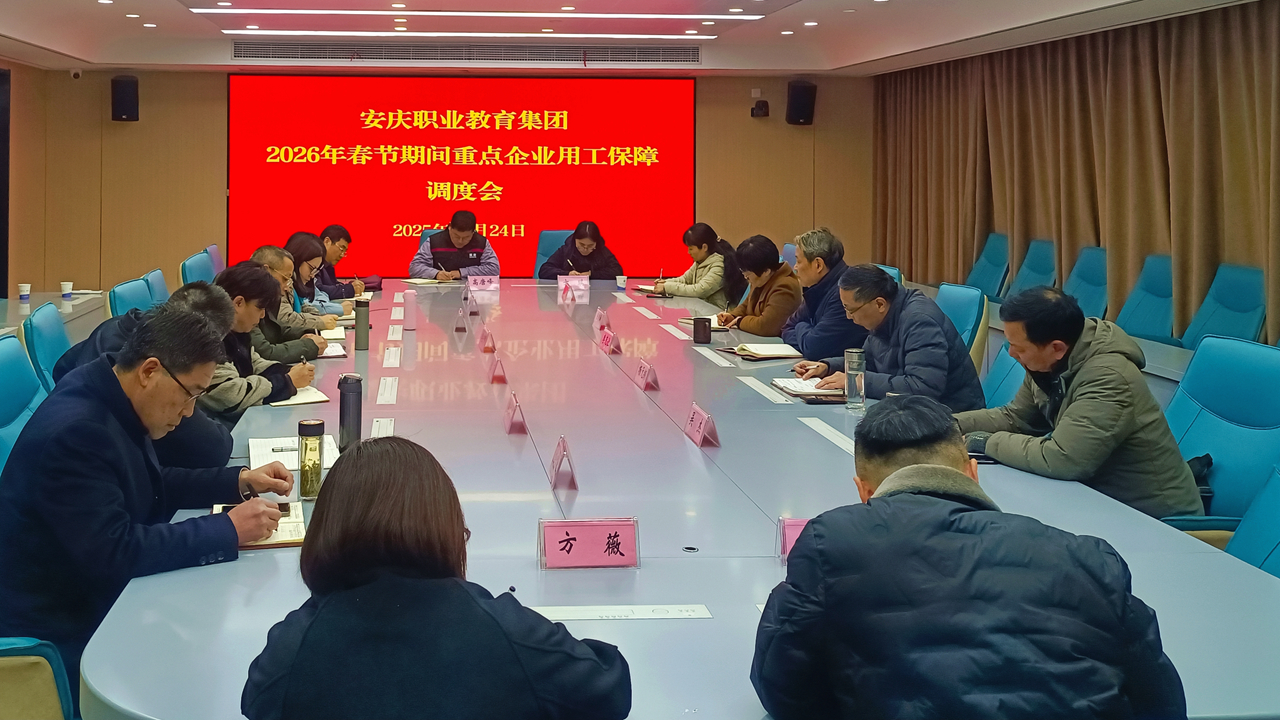 12月24日下午,安庆职教集团在beat365中文官方网站召开春节期间园区重点企业用工保障调度会。安庆职教集团副理事长、秘书长李克让主持会议。安庆技师学院、安庆工业学校、安徽理工学校、安徽化工学校等集团内城区中职、技工院校主要负责人,beat365中文官方网站6个二级学院主要负责人参会。