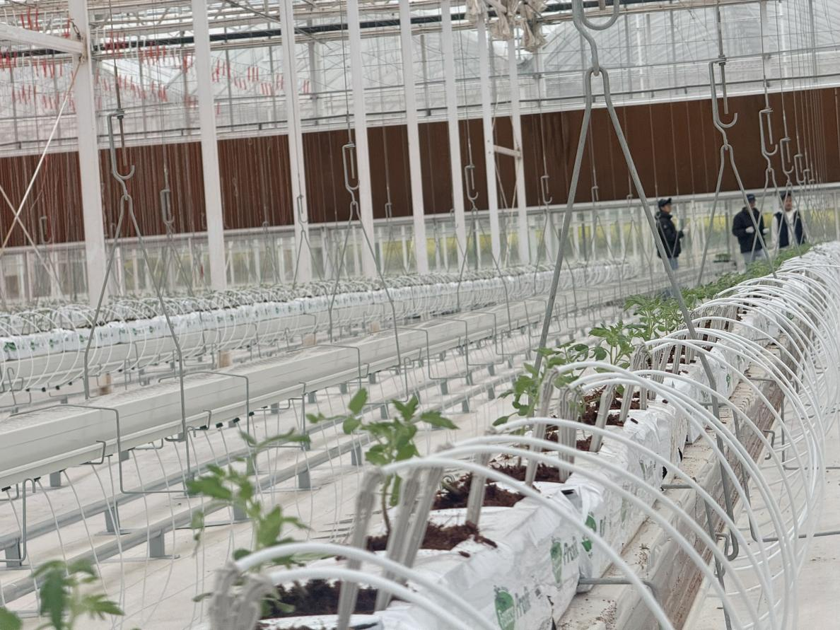 在大棚里,学生们被分为五个小组,分别由五名经验丰富的润科农业技术员担任实践导师,带领大家了解现代化的连栋温室大棚种植技术。技术员向同学们介绍了大棚内的科技设备,随后开始现场示范番茄苗的定植操作。进入动手实践环节,大家2-3人一组、分工协作,小心翼翼地拿起番茄苗,按照技术员示范的步骤,对番茄苗进行定植,在整齐排列的种植槽和刚刚铺设好的椰糠基质植袋上挖孔、放苗、培基质、浇水,种下一株株幼苗。