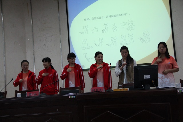 培训会上,陈新民教授以残疾人体育运动发展概况为开篇,讲述了残疾分类和不同残疾类别的运动会及残疾人运动会志愿者工作的主要内容和服务技巧,强调了运动员安全和自身安全的重要性,提出志愿者与运动员相互学习、影响达到双赢的效果。曹灿老师介绍了聋生的心理特征及简单的日常手语表达,上课过程中曹老师与志愿者们进行了互动,形象生动的教授基本的日常手语表达,使志愿者们积极踊跃的参与其中。段蓓蓓老师做最后总结,通过介绍残疾人的心理特点和与他们沟通的技巧、基本礼仪来结束本次长达4个小时的培训课程。