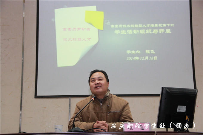 学生处(团委)负责人程飞、公共基础部党总支书记朱松节、教务处副处长储诚炜、心理健康教研室主任张铮,他们在培训期间先后分别以《高素质技术技能型人才培养视角下的学生活动组织与开展》、《党的十八届四中全会精神解读》、《自媒体时代大学生信息汲取与运用的策略——以新浪微博为例》、《学生干部表达能力的提高》为题从不同角度讲解,集中体现做好一名优秀学生干部必须要不断加强个人道德修养,提升自身综合素质,充实完善自己,发挥团队合作精神,提升领导艺术和管理才能。心理健康中心余慧玲老师组织全体参训人员参加了精心设计的综合素质拓展项目活动,鼓励他们不断提高自身的团队合作能力。整个培训虽然时间不长,但内容丰富,程序紧凑,组织有序,对培养和造就一支政治强、品德优,能力强、学习优的“双强双优”型学生干部队伍打下了坚实的基础。