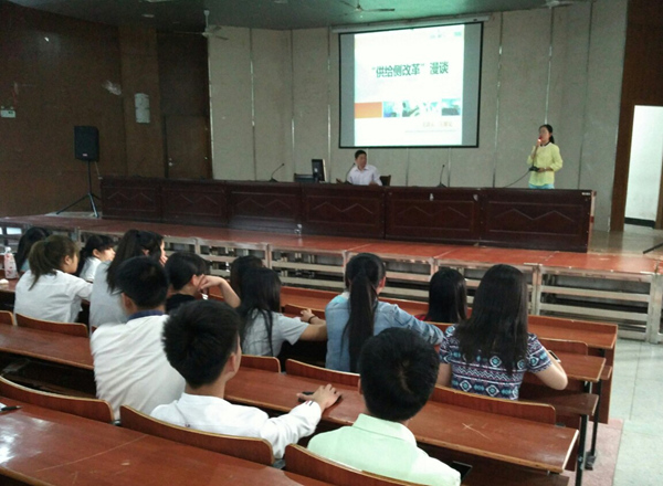 王老师从“为什么会有供给侧改革”“什么是供给侧改革”以及“它会给我们带来哪些风险和机遇”等问题向同学展示了供给侧改革是宏观经济改革的一个重要思路,同时他结合生活中的事例告诫同学们供给侧改革的发展能真正地提升整个行业乃至整个国家经济的发展质量。随后,王老师向现场同学们解释了“减成本”“增效益”“补短板”等供给侧改革的措施含义及具体做法。最后,他强调经济体制改革,特别是通过投资体制改革,需要确定投资方向、投资主体,增加有效投资量等方面,来解决供给侧问题,从而经济即可保持稳定增长。