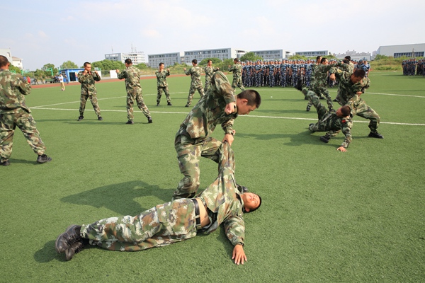 下午3点,大会在激昂庄重的国歌声中拉开帷幕。随着指挥员一声令下,27个方队进行分列式表演,伴着铿锵的旋律,迈着整齐的步伐,同学们英姿飒爽,神采飞扬,以挺拔的军姿、如虹的气势,喊着嘹亮的口号,昂首挺胸、意气风发地从主席台前正步走过,用优异的表现给为期10天的军训画上了圆满句号。分列式结束后,军训教官进行了擒敌拳综合表演,教官动作规范娴熟、刚劲猛烈、孔武有力,赢得了全场的阵阵掌声。