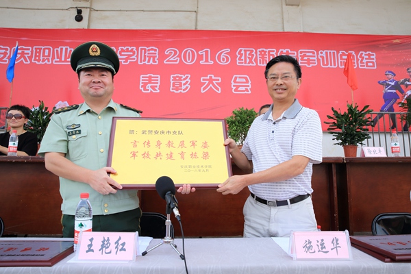 施运华向承训部队赠送锦旗。占峰宣读了《关于表彰2016级新生军训先进集体和先进个人的决定》,院领导和武警支队首长为获奖的优秀连队颁发了奖牌。