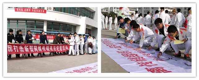 活动通过展板演示、反传销知识讲解和签名活动等形式,进行了相关法律法规知识的普及宣传,提高了广大学生对传销活动的识别能力和防范意识。下一阶段各系将组织召开主题团日活动,宣讲和学习《禁止传销条例》、《关于进一步做好查处网络传销工作的通知》等文件,组织学生观看宣传片《黑梦》,使同学们深刻认识到传销的危害,努力营造 “校园拒绝传销,师生远离传销”的校园环境。同时进一步加强校园内部监控管理,严防外来人员进校园、班级、寝室、社团进行宣传蛊惑及诱骗活动,坚决杜绝传销活动进入校园。