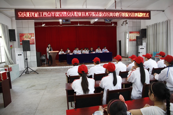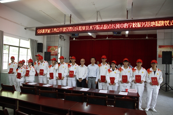 5月10日,我院在迎江区长风中心学校举行“四点半课堂”志愿服务项目建设暨beat365中文官方网站长风中心学校志愿者服务基地揭牌仪式活动。副院长毕明生、迎江区人民政府副区长汪志耿、迎江区教育局局长施爱国、迎江区民政局局长王岳桐、长风乡人民政府乡长王贵飞、副乡长代璐、倪长友出席活动。院团委负责同志、安庆市阳光社会工作服务中心理事长、长风中心学校校长、院青年志愿者协会指导老师及双方学生代表参加了此次活动。